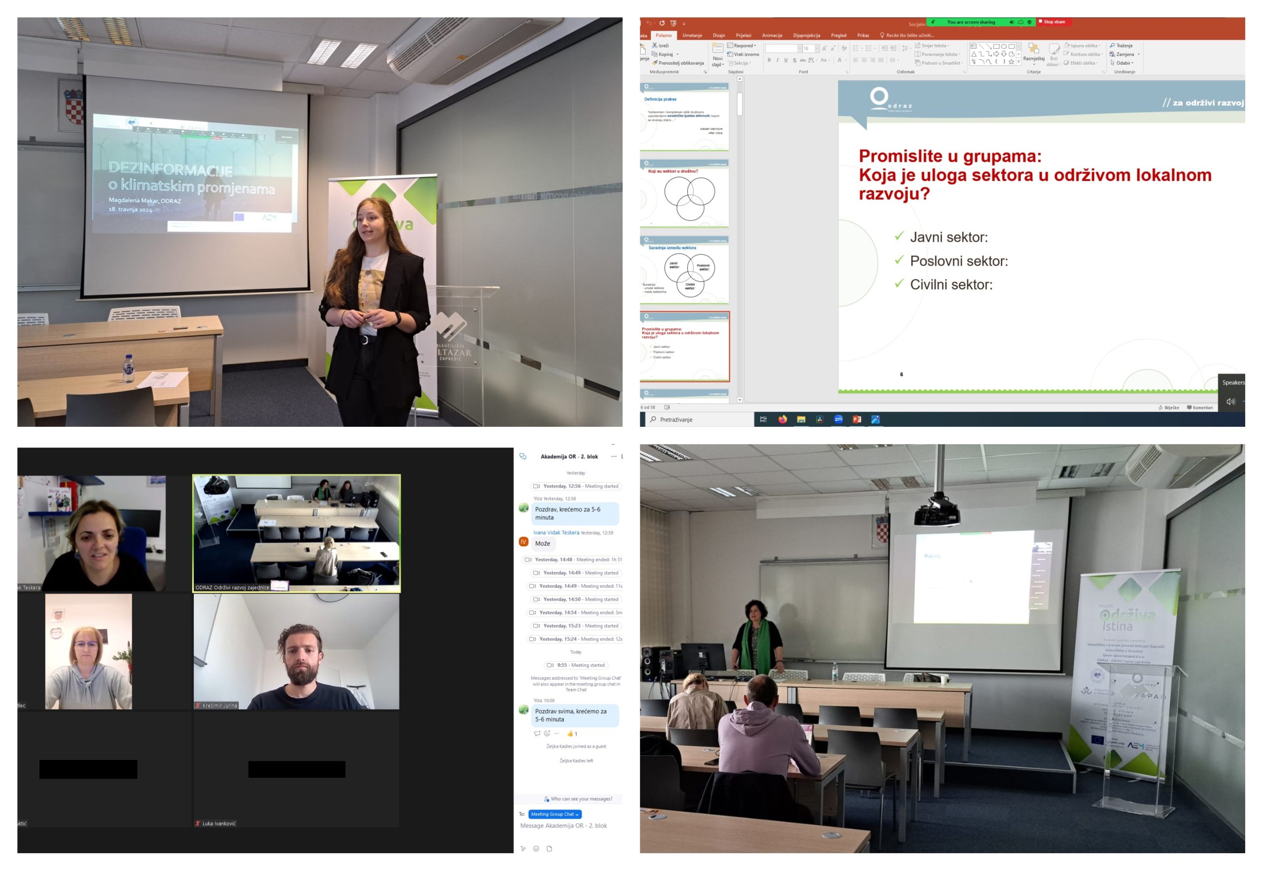 Nakon predstavljanje sudionika, održana je prezentacija o dezinformacijama u području klimatskih promjena. Sudionici su educirani zašto su klimatske promjene često meta dezinformacija; koje su najčešće dezinformacije o klimatskim promjenama; opisani su primjeri oblikovanja javnog mnijenja te izvori dezinformacija, motivacija i interes za njihovim širenjem.